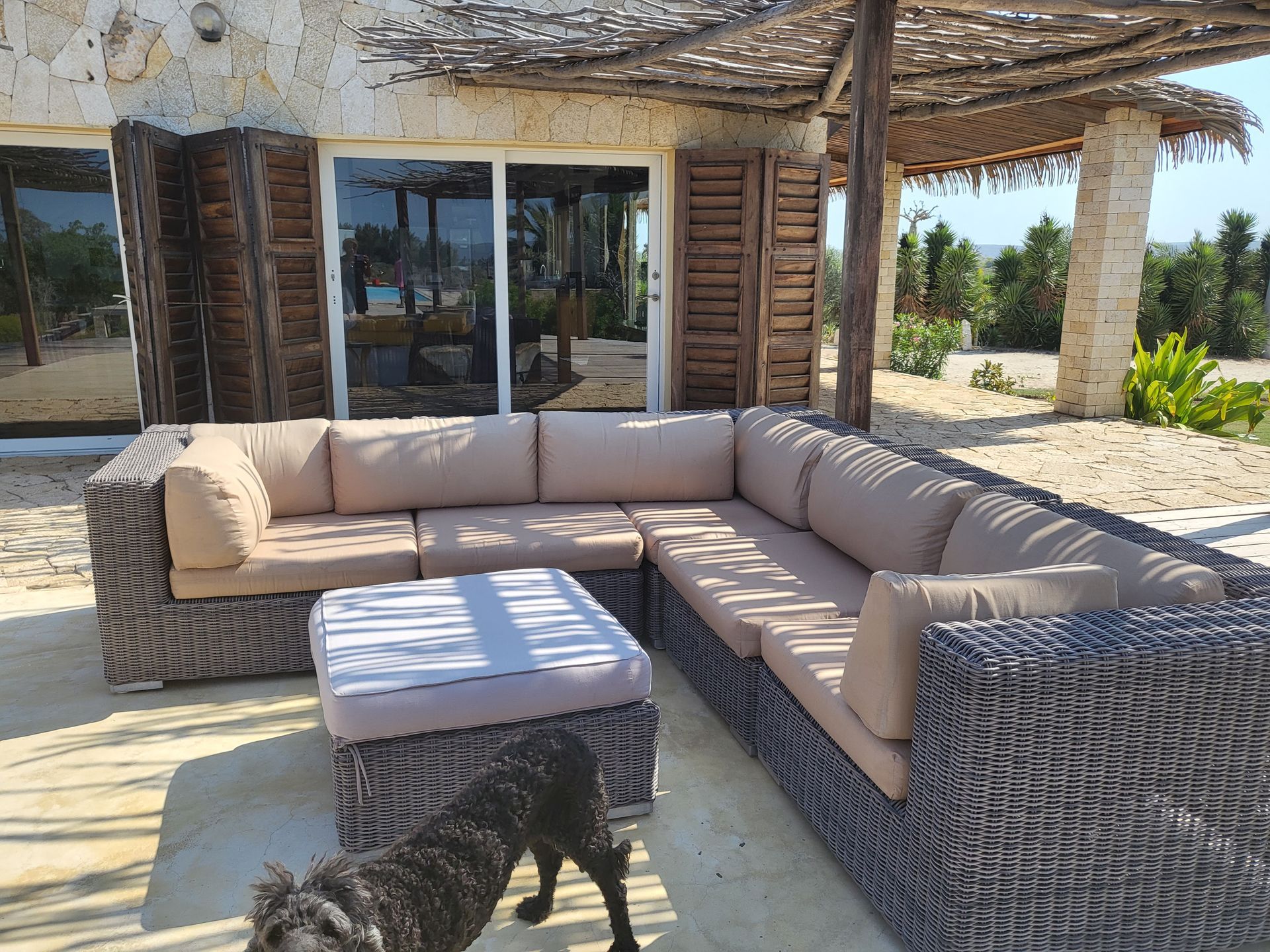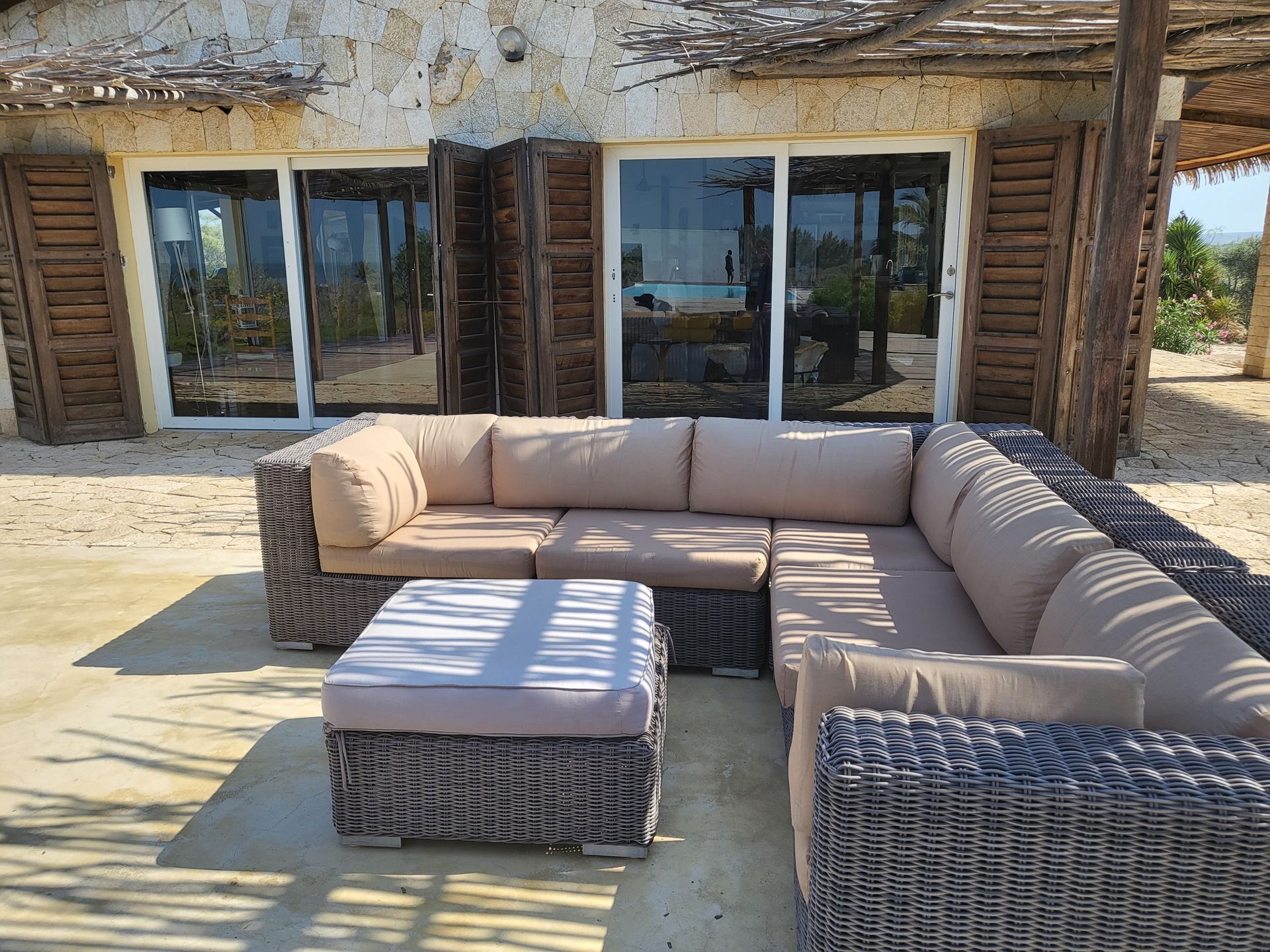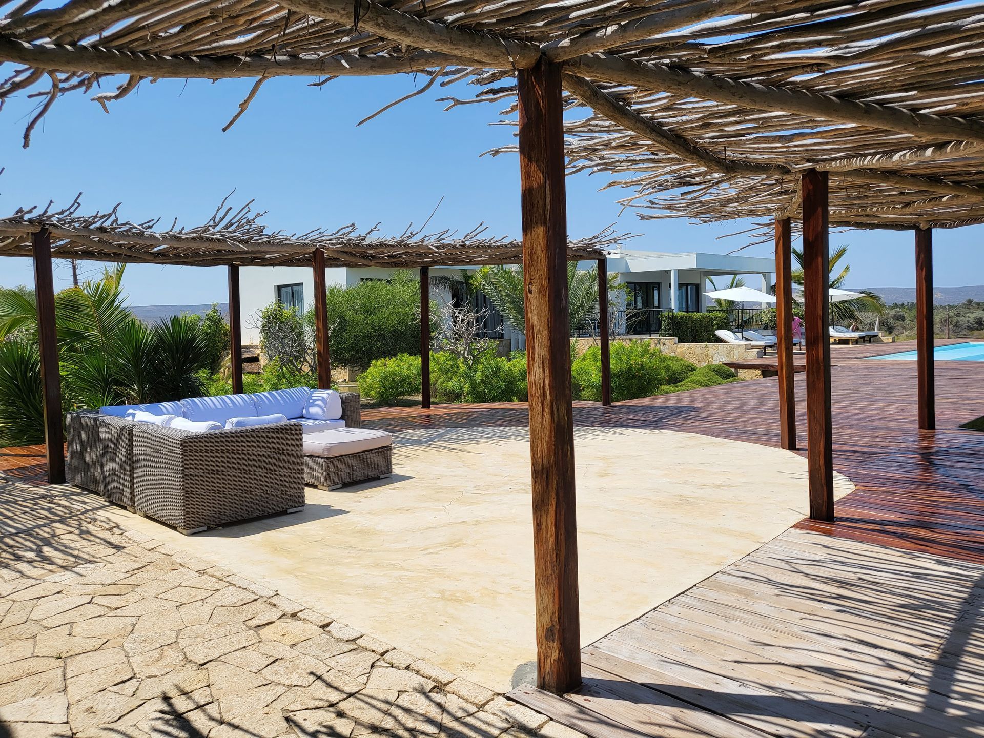 An open and creative space with beatiful detailed decorations. The big windows all around the villa give a great view to the ocean on the one side and to the mountains on the other side.
